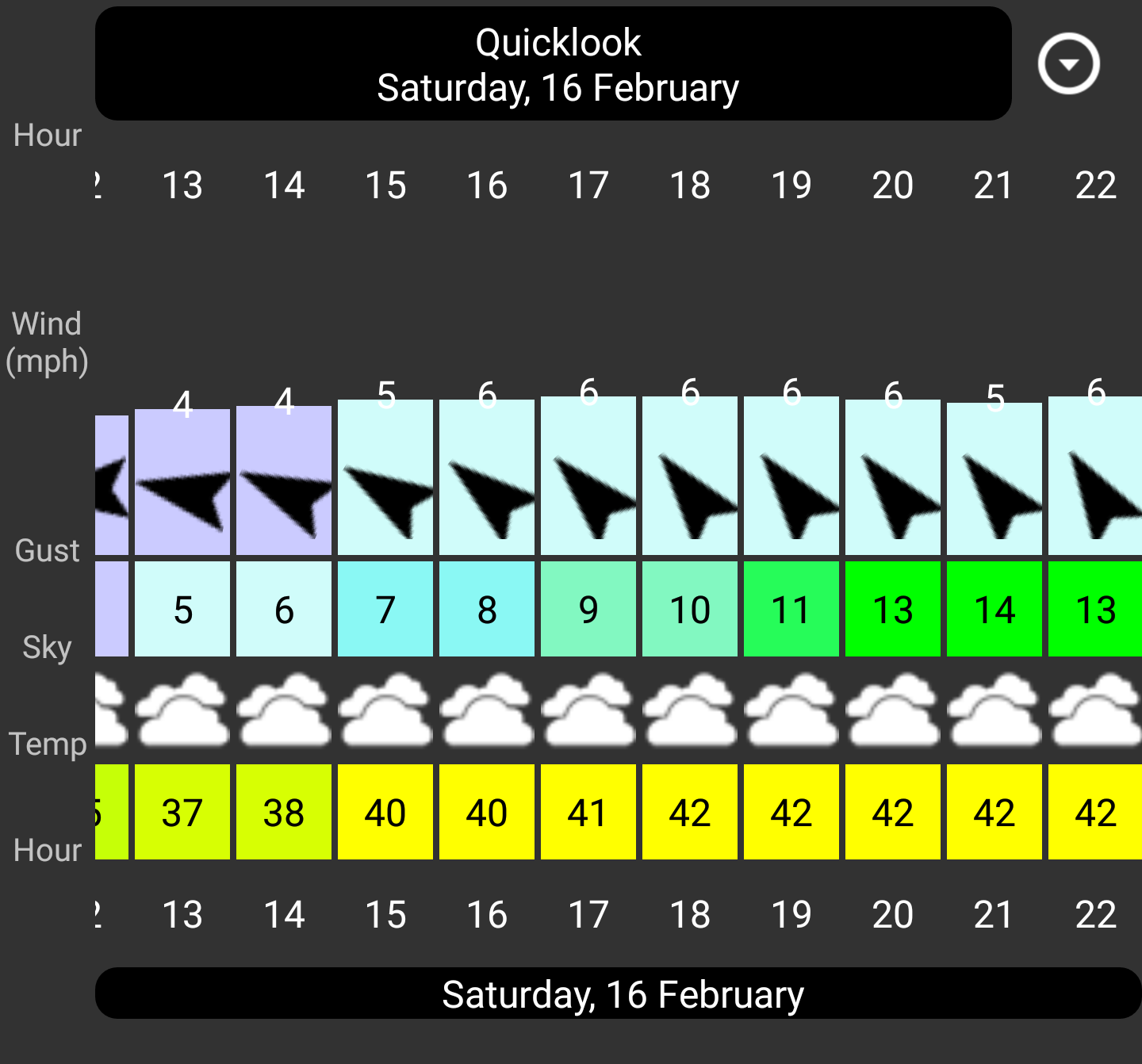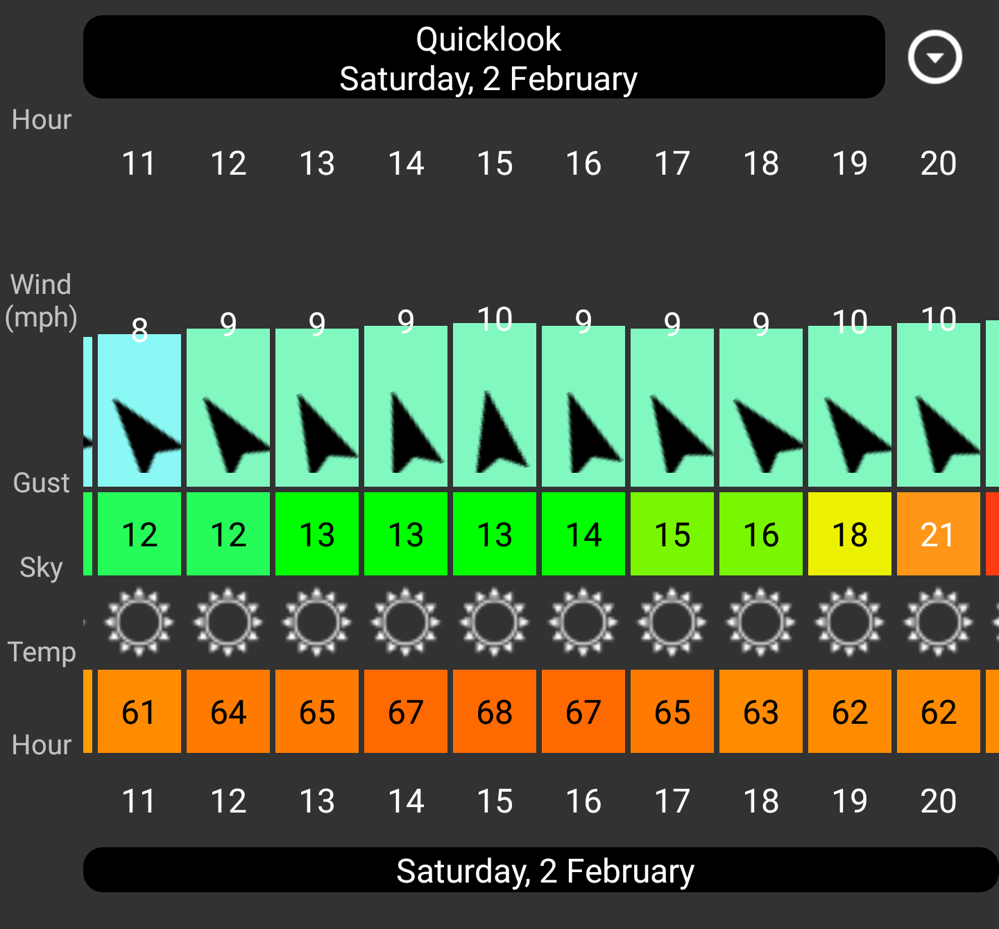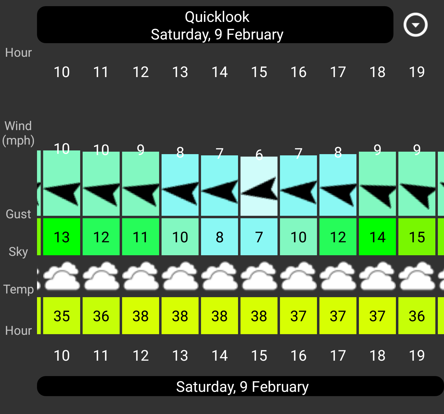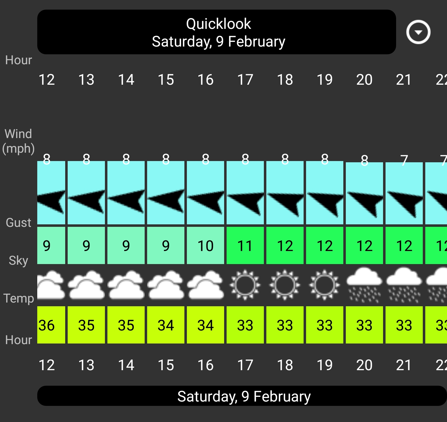 It shows 10mph 34 degrees water 46 overcast is a go. Or 11mph 33 degrees water 46 sunny is a go. All of the scenarios pass on the calculator. Rain would push it over so we have to go and see, i see a 20 percent chance at 2pm but thats it.
